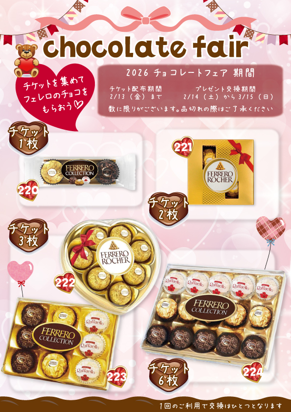 2026.1.05 キャンペーン チケットを集めてもらえるキャンペーン開催中! 期間中チケットを集めるとフェレロのチョコレートがもらえます♪ チケット配布期間:2026年1月5日(月)~2月13日(金) プレゼント交換期間:2026年2月14日(土)~3月15日(日) ※1回のご利用で交換は1つとなります。